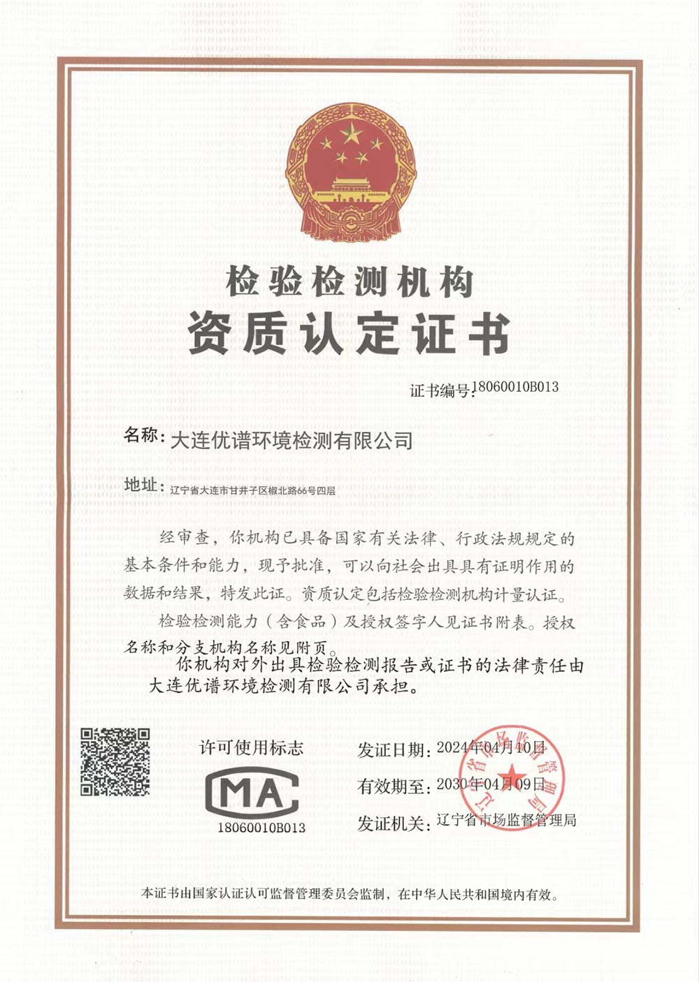 大連優(yōu)譜環(huán)境檢測有限公司是中國領先的第三方權威檢測機構已取得CMA中國計量認證資質(zhì)認定,遼寧省生態(tài)環(huán)境廳備案,具備向社會出具公正數(shù)據(jù)的資格。擁有國際先進的檢測分析儀器和經(jīng)驗豐富的檢測化驗工程師團隊。